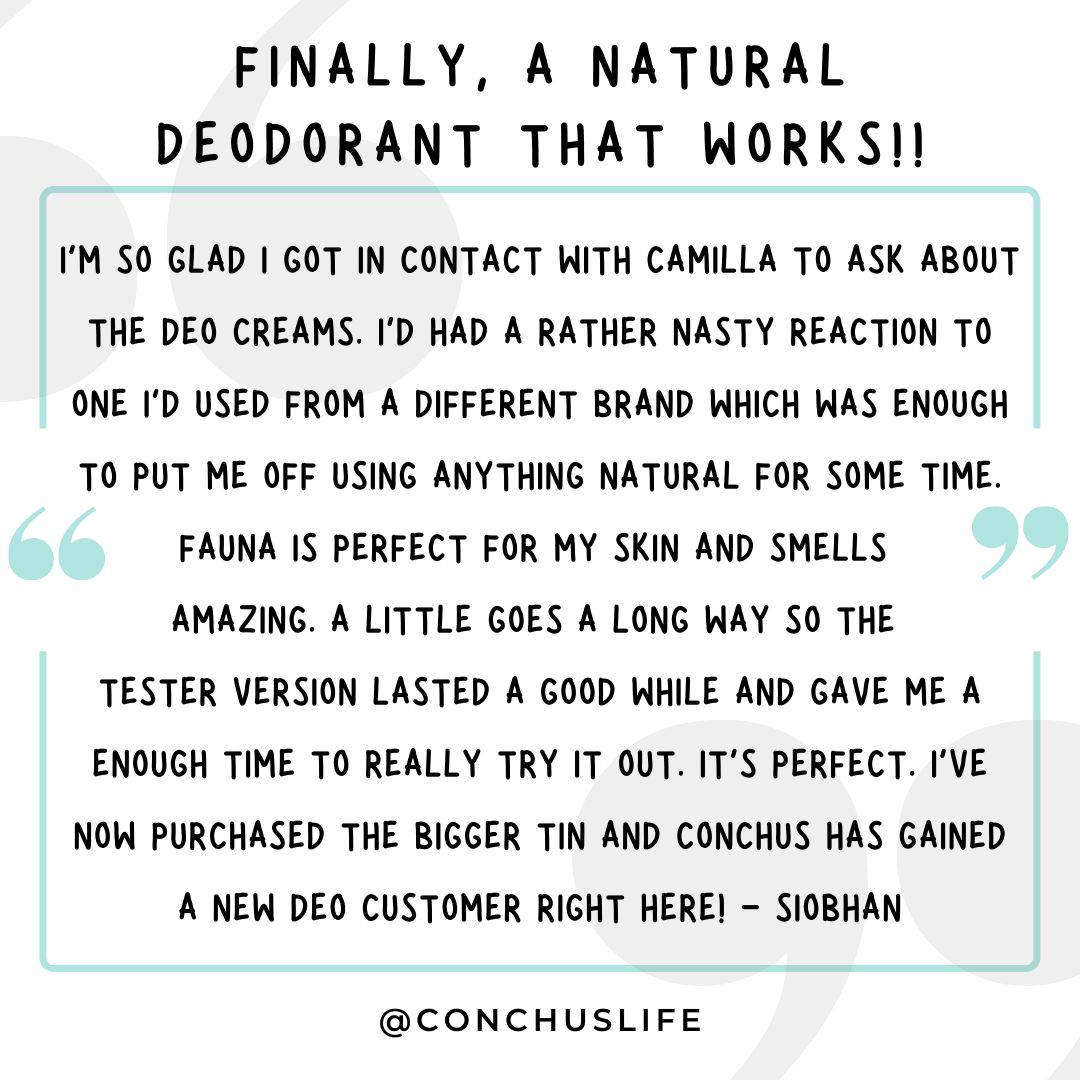 I cannot recommend this deo cream highly enough. Where do I start about what I love about it? My husband does a lot of long distance walking and used to pong a bit at the end of the day. Not anymore! It's amazing how such a little bit of the deo cream can work so well. And for me the best bit of him using this deo cream is there is no sticky residue left on his teeshirts that is such a pain to get clean. He wears dark teeshirts and the sticky white mess left on the underarms by a well known brand of refillable deodorant was truly disgusting and so hard to remove. No laundry problems with Conchus!