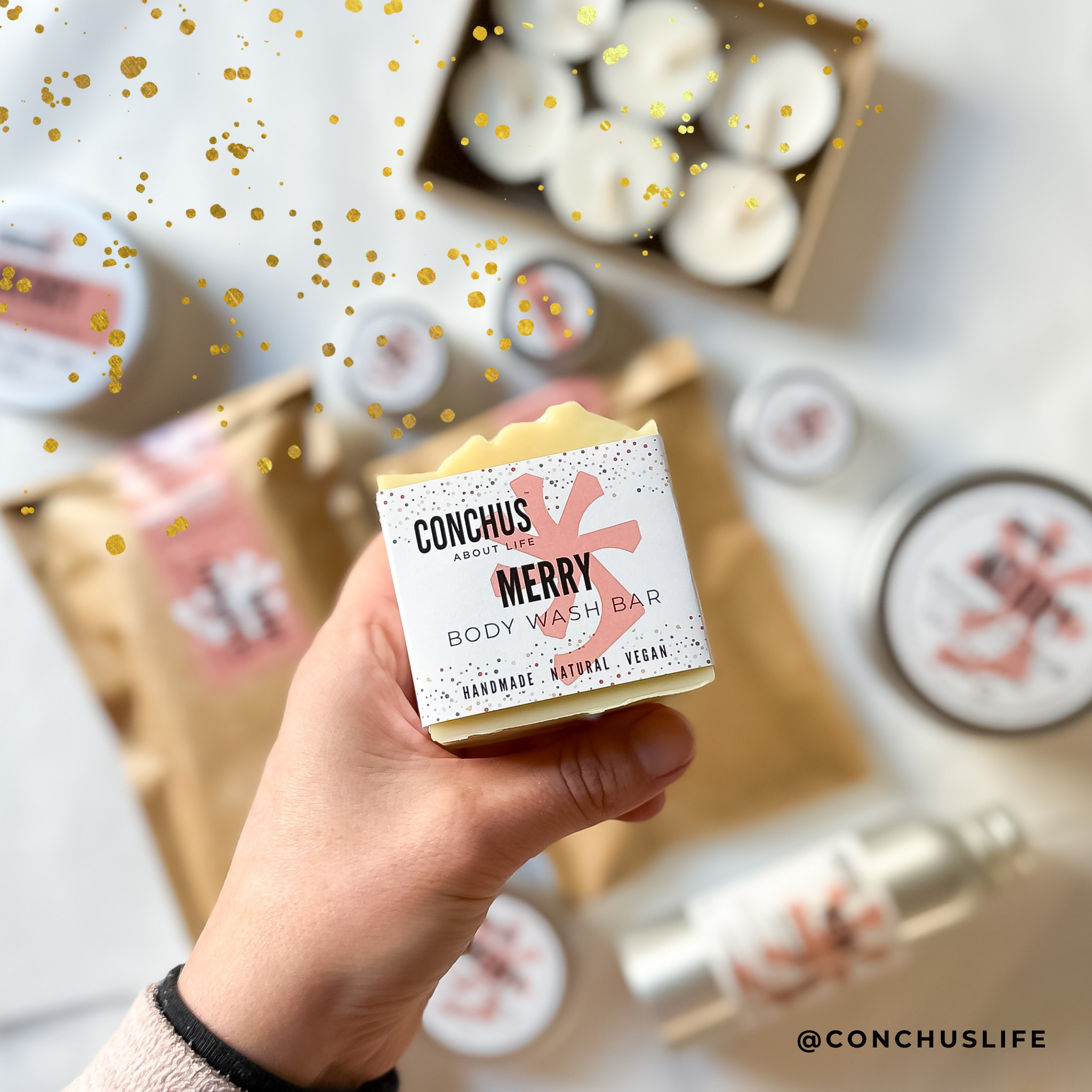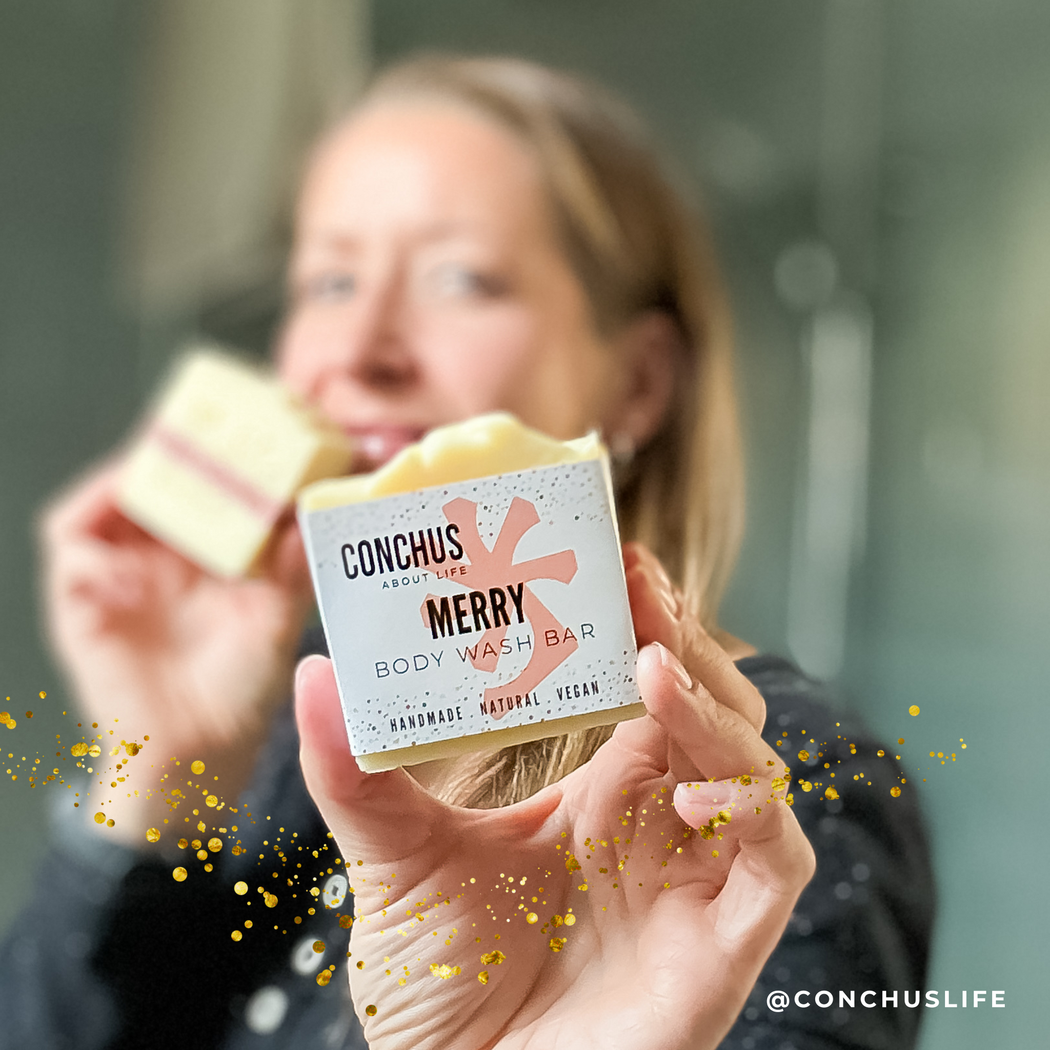 MERRY is a cosy festive hug-in-a-bar. A creamy, comforting lather with just the right balance of gentle cleansing bubbles. Each wash feels soft, warm and grounding, bringing a moment of calm into winter’s busy rhythm.