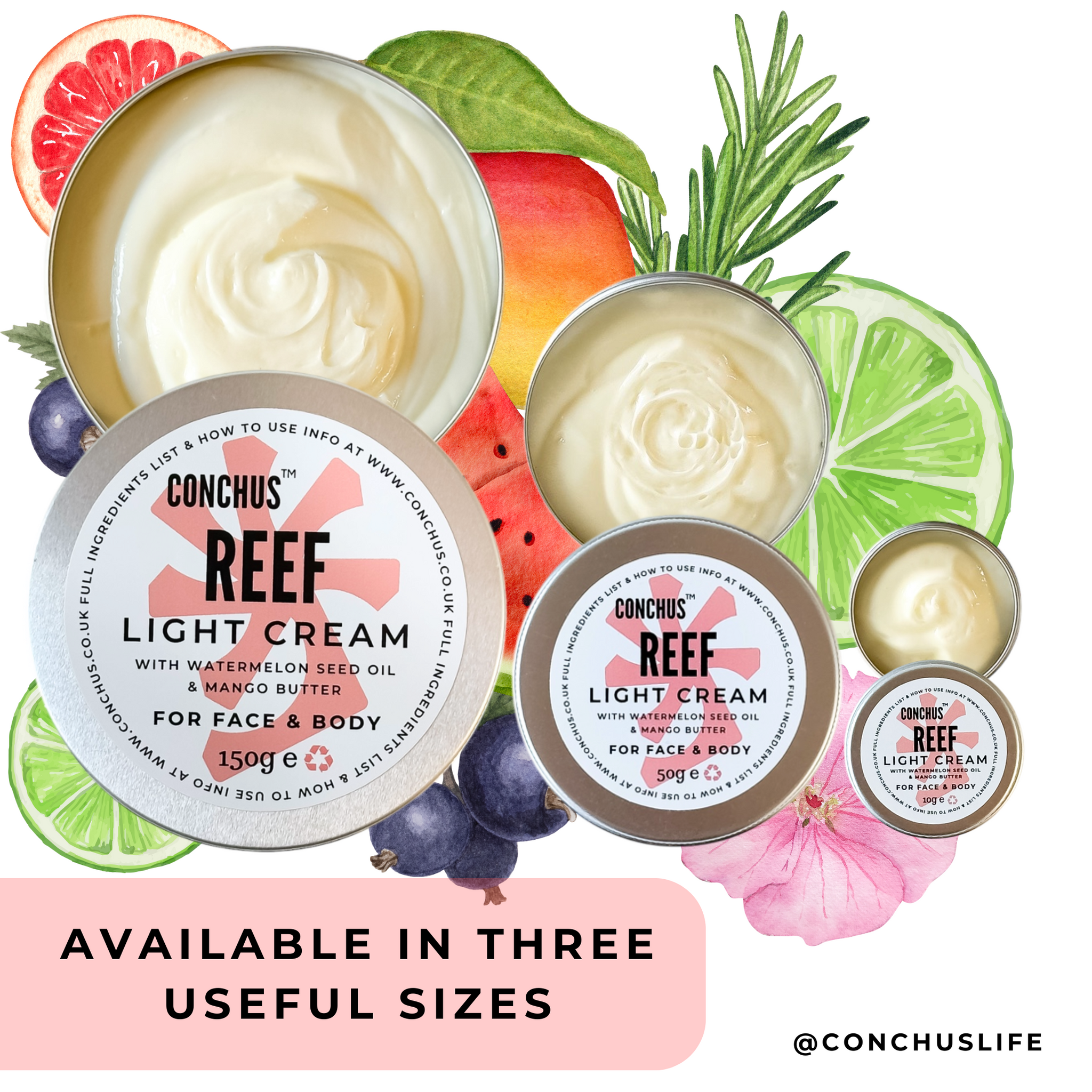 I LOVE this range! I've been using Conchus light cream, oils, deo creams etc., for a few years now. I love Peach Tea, I love Olla, I love Flora, I love Bright.... but Reef??? Gorgeous! The scent is still very light and natural, and for me it's just perfection! So fresh and citrussy, it's like a summer breeze in a tin.